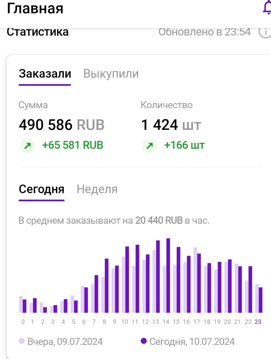 Всем привет. Я продолжаю свой путь к миллиарду на маркетплейсах, и продолжаю честно рассказывать о всех нюансах своего бизнеса. 10 июля 2024 года мои продажи составили практически 500000 рублей, что могу подтвердить скрином из личного кабинета ниже Также, на моем втором аккаунте, продажи также постепенно начинают расти. Точно не помню, был ли до этого день с продажами в 100000 рублей, но вчера вот такая ситуация приключилась