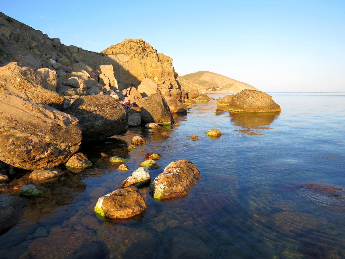 Чтобы, после последних публикаций, все не подумали, что я живу высоко в горах среди сказочных буков, знайте – я живу у моря! Несколько раз в неделю, после работы, Миша забирает меня, и мы едем в Орджоникидзе купаться. Иногда я беру фотоаппарат, а иногда нет. Супер закаты бывают не так часто. Поэтому я решила показать три обычных вечера. Приезжаем на наше любимое место среди каменных глыб часам к 7 вечера. А, вначале 9 уже собираемся домой. Но этих 1-1,5 часов вполне достаточно! Хватает времени и поплавать с маской и полюбоваться на рыбок. Их столько много! Не боятся нас совсем, далеко не отплывают. Кто-то юркнет под камешек, а кто-то просто отодвинется, чтобы ты не достал рукой. Но, как бы ни были вечера похожи друг на друга, от этих видов не устаешь! К этому времени море успокаивается. Опускается тихая нега. Сидим на камнях и просто смотрим в бескрайнюю даль. В голове – ничего. Никаких мыслей о прошедшем дне и никаких планов на завтрашний день. Просто мы и море. Иногда тучи пытают