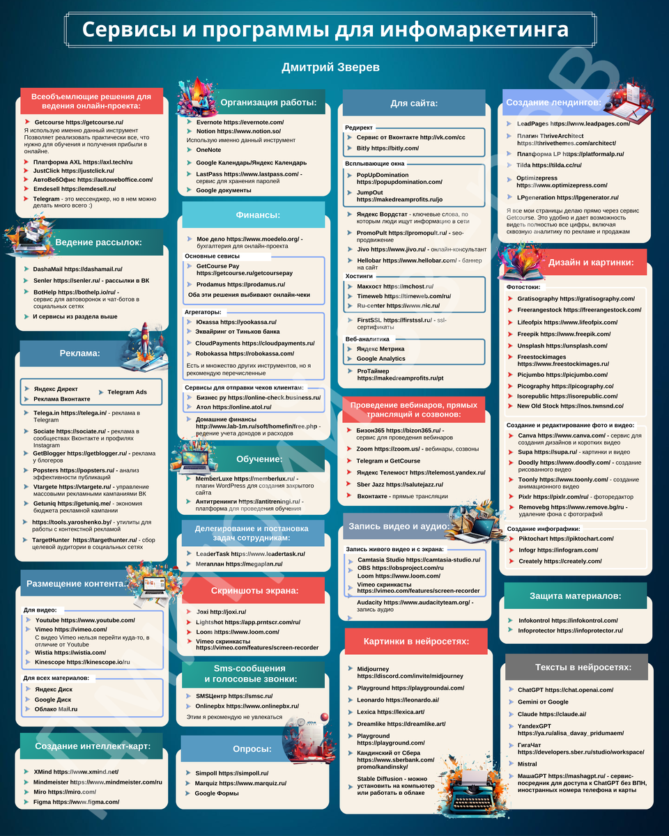 Выше прикреплена картинка с сервисами и программами для инфомаркетинга. Не поскупитесь на лайки, я старался 👍 — Присоединяйтесь к моему Telegram-каналу - там много практичных постов по инфомаркетингу. Дмитрий.