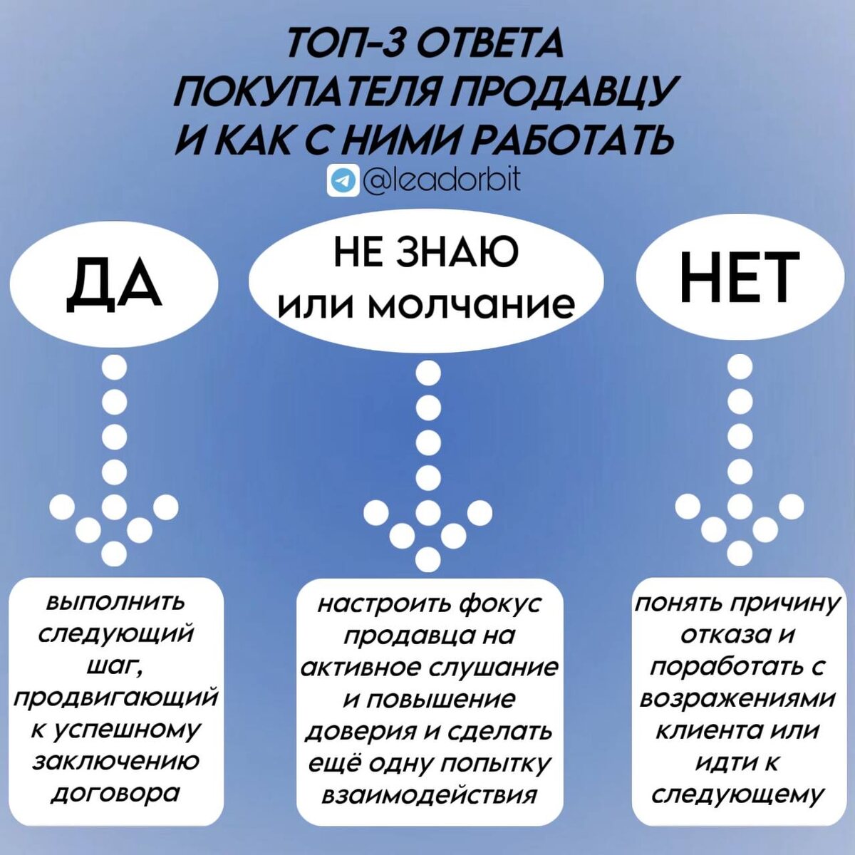 При общении продавца с клиентами есть три основных варианта ответов: 1️⃣ «Да» – хороший ответ, который позволяет продвинуться дальше по циклу продаж. Контролирует этот цикл продаж, конечно, продавец: он должен сразу понимать следующий шаг после ответа «Да». Этот шаг продвигает к успешному заключению договора. 2️⃣ «Нет» – тоже хороший ответ! Если клиент его озвучивает, то можно: • понять причину отказа; • поработать с возражениями клиента; • и если продукт или услуга действительно не интересуют данного клиента – идти к следующему и не тратить время. 3️⃣ «Не знаю» или молчание – это самый неприятный ответ. Задача продавца в данном случае – понять причину сомнений клиента. Здесь фокус продавца полезно настроить на активное слушание и повышение уровня доверия с клиентом. После этого можно сделать следующую попытку взаимодействия с этим или другим ключевым лицом компании. Желаем удачи в продажах! 😉 Увлекательно рассказываю про сферу B2B в телеграм