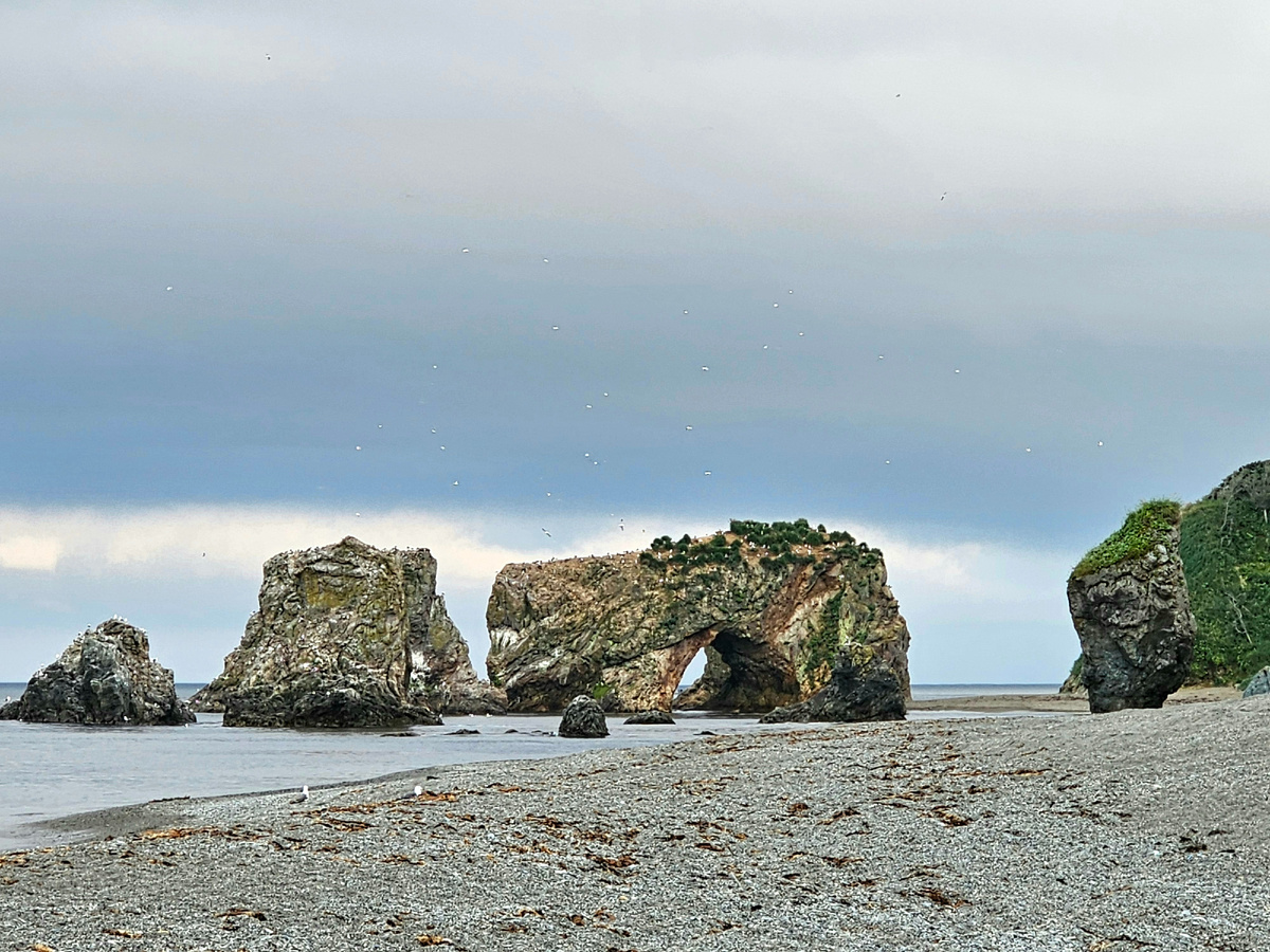 Через час опять в аэропорт. Рейс перенесён на 13.30. Сидим ждём у аэропорта. Рейс перенесён на 14.30... Настроение уже нулевое. Рейс отменен до завтра на 12.30.....тут уже без слов. Тур рассчитан на 3.5 дня, если мы летим завтра , то остаётся полдня. Хочется плакать. А если ещё и завтра не вылетим, то и на Кунашир не попадём, так как у нас билеты на корабль из Итурупа на Кунашир. И из-за всех этих переносов ещё и день на Сахалине теряем. Ехать куда-либо поздно. Но если никуда не ехать, то ещё хуже. Для меня это катастрофа. Есть там на Сахалине мыс Великан. Тур туда достаточно дорогой, и возят туда утром на весь день. Решили вызвать такси. Слышали, что дорога туда плохая, но насколько плохая мы не в курсе. Вызвали такси, думали если такси заказ возьмёт, значит сможет проехать. Приезжает к нам Тайота Приус, спрашиваем водилу- вы там были? Нет. Мы туда доедем?- Навигатор говорит да. Ну поехали. 3000 в один конец, там он нас подождёт и повезёт обратно. Таков был наш грандиозный план . Ехать показывает навигатор 90 км 2.5 часа. Через 60 км нормальная дорога кончилась, повернули в лес, грунтовка. Каждую кочку машина цепляет днищем. Ещё через 15 км таксист нам заявляет, что дальше он не поедет. До места 15 км , время 17.00. Представьте моё состояние. И так день такой, так ещё и это. Дважды катастрофа. Тут я заявляю, что пойду пешком. Муж понимает, что отговаривать меня бесполезно. Лена и Андрей уезжают на такси обратно, оставив нам бутылочку воды. Мы в лесу вдвоём, без связи....тут видим едут машины с туристами, тормозим их, просим подбросить. Мест у них нет, но люди местные и понимают насколько мы безбашенные. На ночь глядя , 15 км в одну сторону, 30 в другую до ближайшего сигнала телефона, у нас ни еды, ни палатки, ничего. Только бутылка воды. Впихивают нас вдвоём в полную машину на заднее сиденье минивэна рядом с гидом. По дороге она нам всякие страсти рассказала про медведей и отругала нас за безбашенность. Сказала, что не оставят нас и обратно отвезут до места. Гид Таня, спасибо огромное!