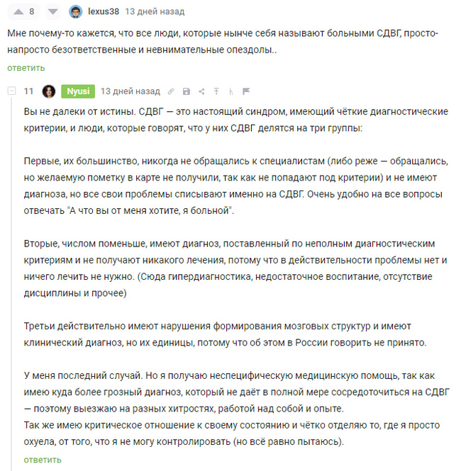 СДВГ - это не про невоспитанных детей, это особенность внутриутробного формирования мозга, сопровождающаяся ограниченным по сравнению с обычными людьми объемом нейромедиаторов (если на пальцах). Это медицинское состояние, зафиксированное в МКБ.