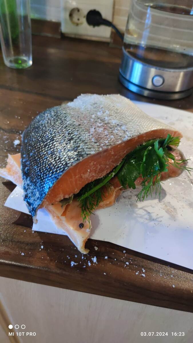 Уже писала про это, но недавно снова спрашивали в комментариях рецепт. Поэтому повторюсь. На работе рассказала и угостила такой рыбой. Те, кто пробовал, подсел на эту вкуснятину плотно. За уши не оттащить. Покупают и солят сами. Не наедятся никак🫣😉😁 Понятно, что можно тупо посолить и сразу есть, но в нашем рецепте вся фишка в сахаре и зелени👍🔥🔥🔥 Форель. Либо семга. Вторая круче, но дороже. И форель то сейчас турецкая продается, а семга чилийская вся идет... Российской что-то два года уже найти не можем)). Одно что рыболовство развито. 😛Мдааа, уж.. Итак, рецепт. Рыбу обтирают. Кожу ножом подчищают, убирают слизь, все лишнее, внутри так же. Сушат салфеткой. Кожу сверху сахарят, этот делают для того, чтобы потом изнутри было проще срезать рыбу от кожи. Солят и внутри и снаружи. Соль с сахаром не смешивают! Именно, что делать надо по порядку. Внутрь подойдет крупная соль. Лаврушка, перец горошком тоже во внутрь. Свежий укроп веточками и петрушку. Закрываем в контейн
