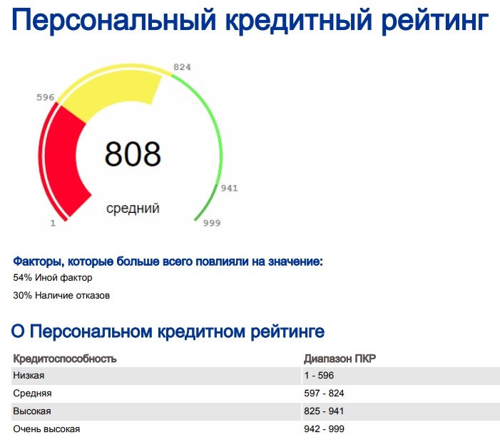 Что посмотреть в этом отчёте? В первую очередь найдите раздел «Персональный кредитный рейтинг». Там есть информация похожая на ту, что на картинке. И она сразу покажет вам, насколько велика вероятность одобрения вам кредита, даже если по всем параметрам (уровень дохода, залог и пр.) всё хорошо. Обратите внимание, что шкала ПКР выглядит очень неравномерной. То есть, из 1000 возможных баллов вам нужно иметь 825 и более и только тогда вы будете считаться высоко кредитоспособным. Меньше 825, но больше 596 – кредитоспособность средняя. Тут ещё есть указание, какие факторы повлияли на оценку. На моей картинке 30% влияния – наличие отказов.