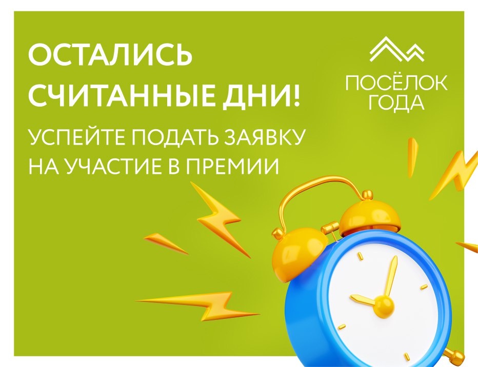 Считанные дни до окончания приёма заявок на Премию «Посёлок года»! “Посёлок Года” — единственная профильная премия, учрежденная для отбора и награждения проектов загородного девелопмента. А еще «Посёлок года» — это: • Многолетняя история. • Авторитет на рынке. • Прозрачность оценки. Победа в премии принесет вам: • Признание среди профессионалов в сфере загородного строительства • Доверие покупателей • Дополнительные инвестиции Все участники получают мощное pr-продвижение проектов. Независимый аудитор премии “Технологии доверия” следит за соблюдением прозрачности на всех этапах. Уже восемнадцать регионов по всей стране участвуют в премии, включая Московскую область, Ленинградскую область, Республику Крым и многие другие! Подать заявку 🔥