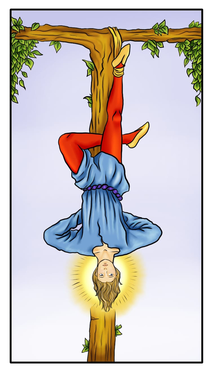 Если размышлять об Аркане Повешенный в общем, то это отказ от чего-то дорогого ради чего-то большего: "отдаю, чтобы получить". Это архетип обмена, в котором сначала нужно принести жертву, заплатить цену, а уже потом получить желаемое. Примером служит путь Христа или Одина - они проходили через страдание ради высшей цели. Но если человек не готов заплатить цену (которая порой бывает слишком высокой), он оказывается в состоянии застоя, застревания и не способен двигаться дальше.