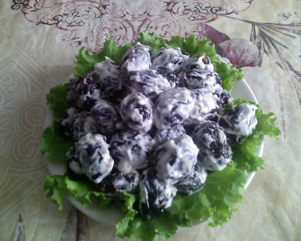 Это очень вкусная остро-сладкая закуска. Возни много, но оно того сто́ит. Она не сезонная, потому что продукты доступны круглогодично. Что? • чернослив без косточек • грецкие орехи (я сразу беру очищенные) • кинза свежая ( заменить нельзя, сильно потеряет во вкусе) • чеснок свежий • сметана 20% Как? 1) запариваем кипятком чернослив 2) грецкий орех измельчаем, но не в кашу, а мелкими кусочками. 3) кинзу шинкуем очень мелко в равных пропорциях с грецким орехом, смешиваем. 4) через пресс выдавливаем чеснок в наш "фарш" , присаливаем, заправляем сметаной. Тщательно вымешиваем. Пробуем на соль и чесночную остроту. Остроты должно быть чуть больше, чем надо. 5) распаенный чернослив надрезаем и фаршируем. 6) выкладываем на блюдо и сверху промазываем густым слоем сметаны. (Можно смешать с зеленью ) Закусочке дать настояться часик, перед подачей освежить верхний сметанный слой. И украсить порубленной зеленью и листьями салата, порезанными полосками. Кто любит — сруколла сюда отлич