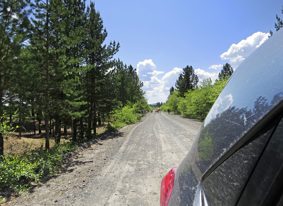 Километра в 40 восточнее Кяхты, что в Бурятии на монгольской границе, мы переехали Чикой и за ним свернули на просёлочку: Которая привела нас в Полканово - просторное, даже пустое, но явно старое и всё же не совсем безлюдное село: От него до нашей цели - 7-10 километров, и примерно половину этого пути мы смогли-таки одолеть неспешной ездой по лесным просекам. За Полкановом - типичный сибирский пейзаж: А на дороге, по которой мы пошли пешком, запарковавшись в траве - то следы парных копыт, то розоватые камни: Июнь - цветущее время, и особенно впечатляюще цветы смотрятся с набившимися в них насекомыми: Дороги ветвятся по лесу, и на одной из них нас обогнала "Нива", а чуть позже мы слышали издалека ружейную стрельбу. В сибирской тайге - своя жизнь, но если вы забрались в этот угол, чтобы увидеть пески Аманхан - то общий принцип тут "держаться левее". В какой-то момент за соснами потянулся естественный вал, в котором сложно не узнать песчаную дюну под тонким слоем хвои и земли: А за её зам