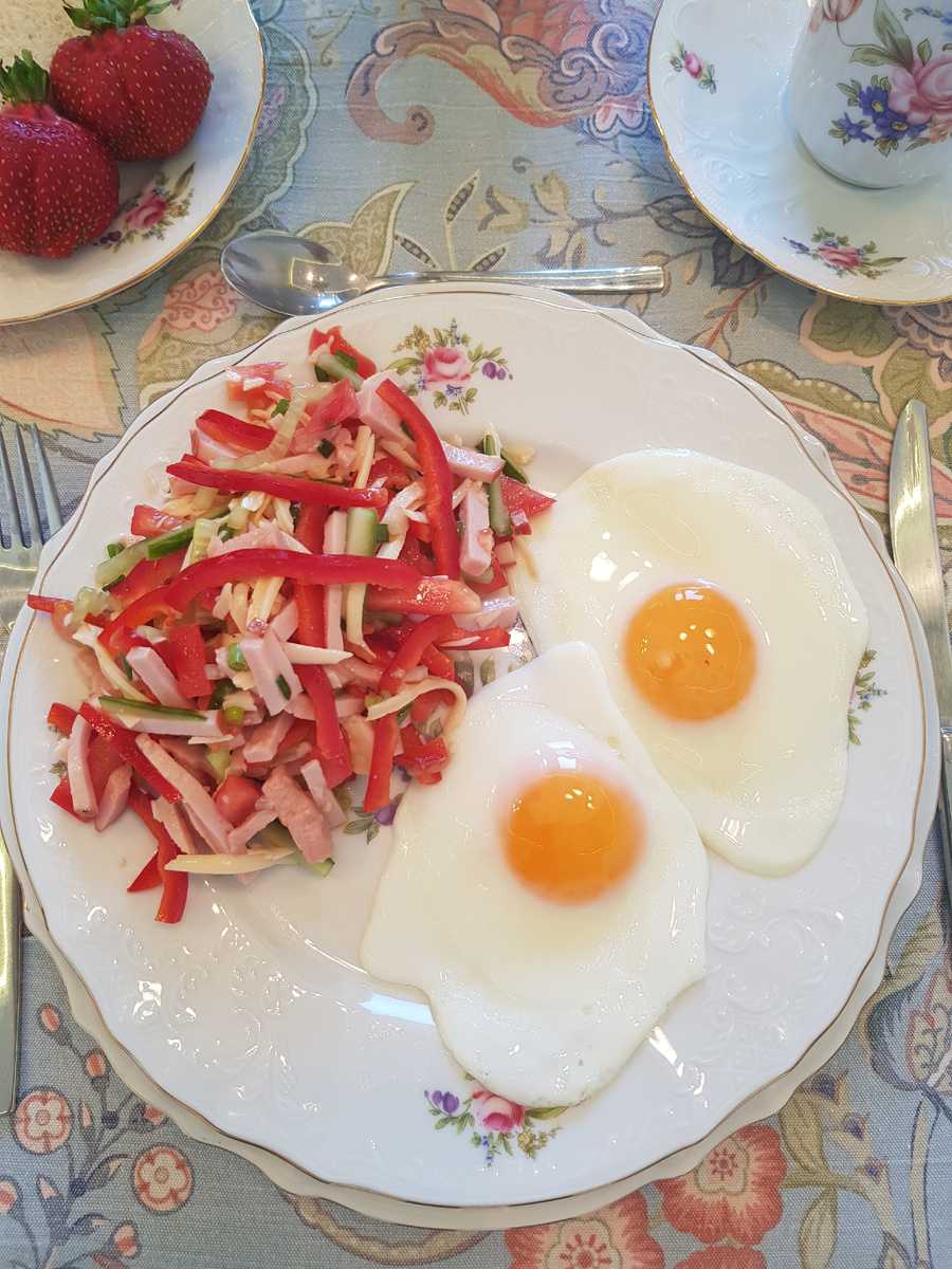 Доброе утро, дорогие друзья! Сегодня я предлагаю всем, кому наскучила окрошка, приготовить летний салат и яичницу. Для приготовления нам понадобятся: свиной копчёный окорок 300 грамм, сыр 100 грамм, 1 сладкий перец, 1 огурец, 1 помидор, 1/2 лимона, 2 зубчика чеснока, 3 веточки зелёного лука, 1 столовая ложка оливкового масла, 1/4 чайной ложки соли, 8 яиц. Приготовление: перец, огурец, окорок, помидор нарезать соломкой. Лимон разрезать и из половинки выжать сок. В оливковое масло добавить соль, сок лимона, измельчённый чеснок. Сыр натереть на крупной тёрке и добавить в салат. Зелёный лук нарезать и положить в салат. Салат перемешать и заправить соусом. На сковородке приготовить яичницу. Выложить салат и яичницу на тарелку. Приятного аппетита и хорошего летнего дня!!!
