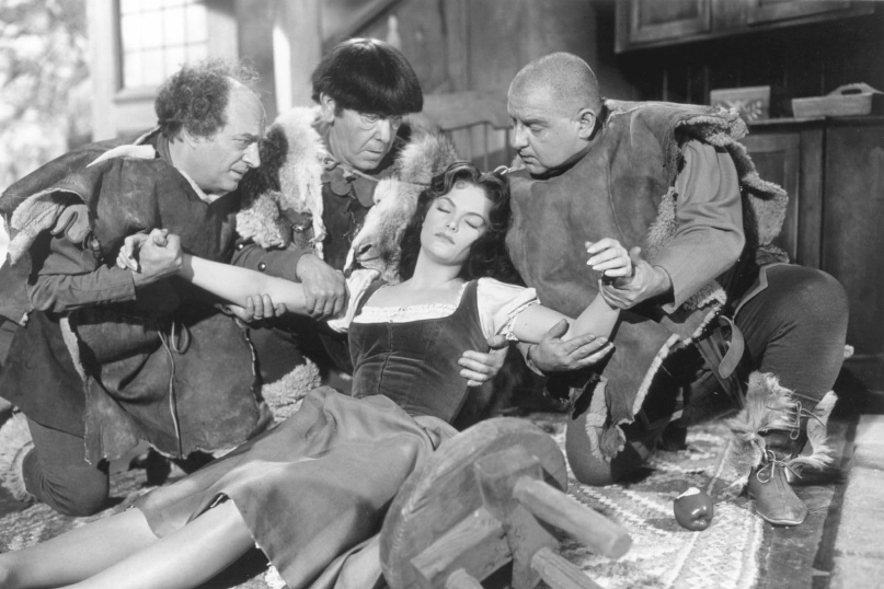 Лента «Белоснежка и три бездельника», как сказали бы сейчас, стала кроссовером, объединяющим два IP: собственно героиню братьев Гримм (и некоторых других персонажей сказки) и популярное комедийной трио Три бездельника (или Три балбеса), заменяющее семерых гномов в образах веселых странствующих лекарей.