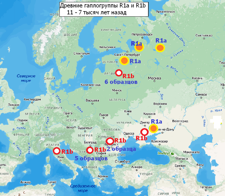 С другой стороны, конфигурация этих гаплогрупп в Европе, начиная с 10-11 тысячелетия назад, представляет собой очень интересную картину, которая показывает, что не всё гладко было в их взаимоотношениях не только в недавнем, но и в более далеком прошлом. По крайней мере, массового их слияния не наблюдалось. И территория Восточно-Европейской (Русской) равнины предстала ареалом обитания носителей гаплогруппы R1a, окраины же ее как восточная и южная, так и западная – занимали носители R1b.