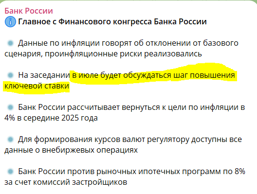 Сейчас, перед заседанием 26 июля, никто и не заикается о снижении ставки, наоборот, все, в том числе руководство Банка России, думают о том насколько ставку нужно повысить.