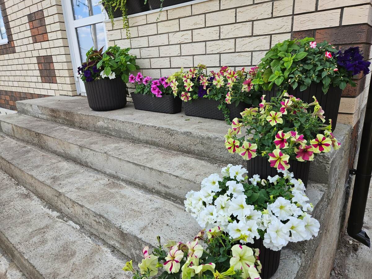 Конечно решение сажать только ампельные было скорее эмоциональным, чем обдуманным. Современные хорошие семена кустовых крупноцветковых петуний позволяют вырастить не идеальное безуходное растение, но близкое к тому. И самое главное их преимущество - такие петунии можно посадить в небольшие кашпо (у меня это 8-литровые емкости), а значит получится украсить ими балконные ящики или входную зону крыльца.