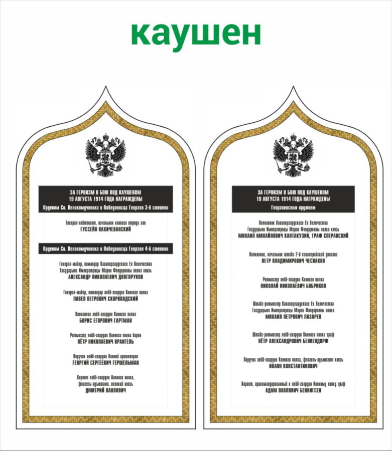 В Гусеве к 110-летию начала Первой Мировой войны планируют увековечить память барона Петра Врангеля (после 1917 года один из главных руководителей Белого движения) и генерал-майора Павла Скоропадского, ставшего после революции 1917 года украинским гетманом. Фамилии военачальников, как сообщил «Новому Калининграду» исполняющий обязанности директора калининградского Историко-художественного музея Сергей Якимов, собираются поместить на мемориальных табличках, посвященных офицерам, ставшим георгиевскими кавалерами по результатам Каушенского сражения. Якимов пояснил, что увековечение памяти об этих военачальниках поможет выйти из состояния гражданской войны. «Они воевали? Воевали, — заявил историк. — Оружие георгиевское получили? Получили. Подвиг совершили? Совершили. Что еще нужно, господи? А кем они потом стали... Вон возьмите генерала Власова. В „Красной звезде“ в 1941 году был огромный его портрет как защитника Москвы. Кем он потом стал? Предателем родины. Я предлагаю оставить тему поли