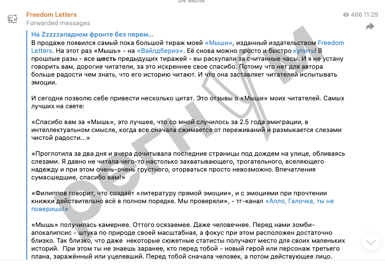 Иноагент Иван Филиппов, сбежавший после начала СВО из страны и называющий оставшихся в России граждан не иначе как «z-гнидами», продает свой новый роман на самом популярном стране маркетплейсе. Мало того, даже рекламирует его продажи со своей страницы. Краткий синопсис "Мыши", писать который автору помогала радующаяся беспилотникам над Москвой иноагент Татьяна Лазарева вполне антироссийский и очень незамысловатый: Глава страны - тиран и диктатор хочет бессмертия и по его указу в застенках Кремля проходят опасные исследования. Из-з халатности сотрудников инфицированная мышь сбегает из лаборатории и заражает зомби-вирусом всех россиян. Русофоб-иноагент Леонид Волков уже похвалил новый роман иноагента же Филиппова: