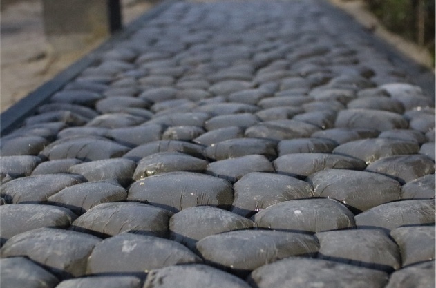 Булыжники изготавливались из смеси цемента и песка в соотношении 1:3. С помощью упаковочной пленки формировались и устанавливались вплотную друг к другу.