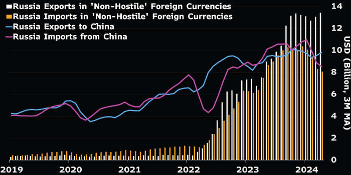 Спрос на юань со стороны РФ, который может еще больше увеличиться из-за недавних санкций США в отношении ее финансовой инфраструктуры, вероятно, побудит торговых партнеров Китая принимать юань в качестве оплаты за свой экспорт, чтобы в дальнейшем использовать его для покупки российской нефти, пишут экономисты Bloomberg. Белая и желтая гистограммы — экспорт и импорт РФ в валютах дружественных стран, голубая линия — экспорт из РФ в Китай, розовая — импорт в РФ из Китая (в млрд USD в месяц, среднее значение за три месяца). Источник: Bloomberg Западные санкции против российской нефти помогают Пекину интернационализировать юань. Спрос на юань со стороны РФ, который может еще больше увеличиться из-за недавних санкций США в отношении ее финансовой инфраструктуры, вероятно, побудит торговых партнеров Китая принимать юань в качестве оплаты за свой экспорт, чтобы в дальнейшем использовать его для покупки российской нефти. Тем не менее объем торговли между Китаем и Россией, который выступает глав