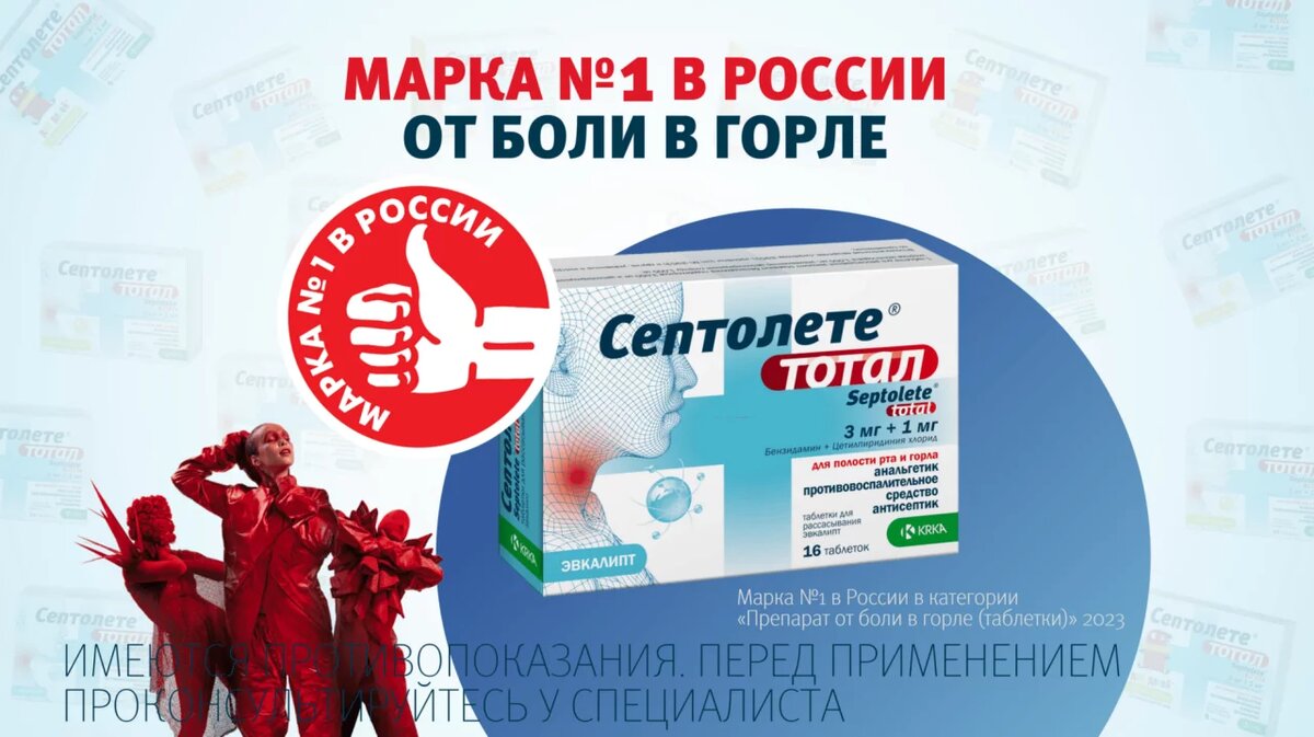 Септолете® Тотал – Лауреат премии «Марка №1 в России» 2023 г. в категории «Препарат от боли в горле (таблетки). Тотальное действие против боли в горле позволяет Септолете® Тотал быть вашим надежным помощником в период простуд для всей семьи, помогая избавиться от боли в горле и снизить риск заражения родных и близких. Мы стали номером один, благодаря вам❤️ Спасибо, что выбираете нашу продукцию!