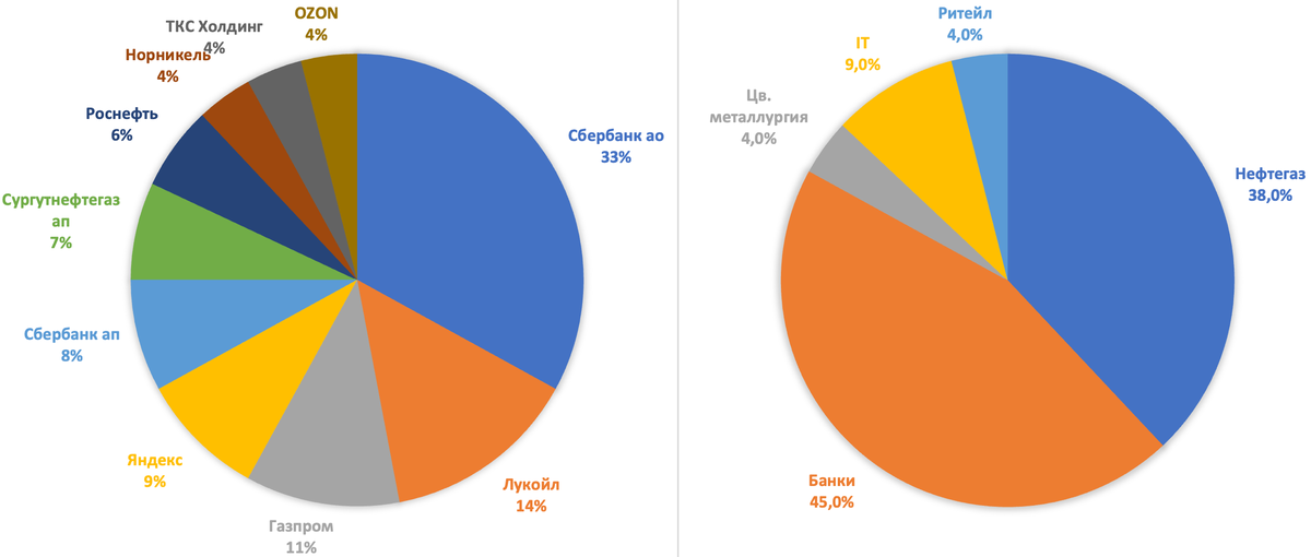 Как выглядит портфель акций РФ у среднего инвестора («народный портфель») на Мосбирже по итогам июня: 1. Сбербанк ао - 33% 2. Лукойл - 14% 3. Газпром -11% 4. Яндекс - 9% 5. Сбербанк ап - 8% 6. Сургутнефтегаз ап - 7% 7. Роснефть - 6% 8. Норникель - 4% 9. ТКС Холдинг - 4% 10. Ozon - 4% Данные с сайта Мосбиржи. Северсталь и Магнит выбыли из портфеля. Вместо них впервые вошли в список ТКС Холдинг и Ozon. Остальные позиции остались на тех же местах в рейтинге, слегка изменились доли. По секторам: Банки - 45% Нефтегаз - 38% IT - 9% Цв. металлургия - 4% Ритейл - 4%