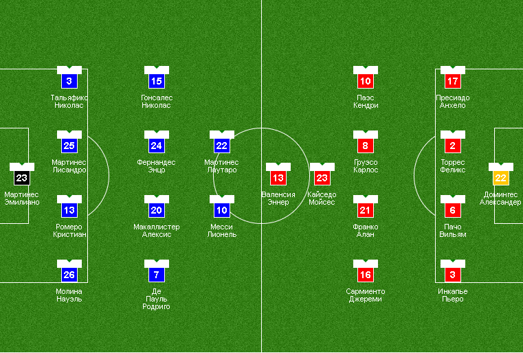 Сегодня состоялся четвертьфинальный матч Кубка Америки – 2024 между сборными Аргентины и Эквадора. Стартовые составы команд: Аргентина: Эмилиано Мартинес, Науэль Молина, Лисандро Мартинес, Кристиан Ромеро, Николас Тальяфико, Алексис Мак Аллистер, Родриго Де Пауль, Энцо Фернандес, Лионель Месси, Нико Гонсалес и Лаутаро МАртинес. Эквадор: Александер Домингес, Анхело Пресиадо, Феликс Торрес, Вильям Пачо, Пьеро Инкапье, Карлос Груэсо, Кендри Паэс, Алан Франко, Мойсес Кайседо, Джереми Сармиенто и Эннер Валенсия. Первая половина матча была под контролем Эквадора. Они создавали моменты моменты и всячески напрягали вратаря сборной Аргентины - Эмилиано Мартинеса. Далее случился по-настоящему голевой момент: экс-нападающий «Вест Хэма» рванул по флангу и прострелил на партнёра из «Брайтона», который накрутил Ромеро (Кристиан после лишь развёл руками) и пытался проткнуть мяч мимо Мартинеса — тот красиво спас ногой. На 34-ой минуте матча Энцо Фернандес нанес свой удар и заработал угловой. После нав