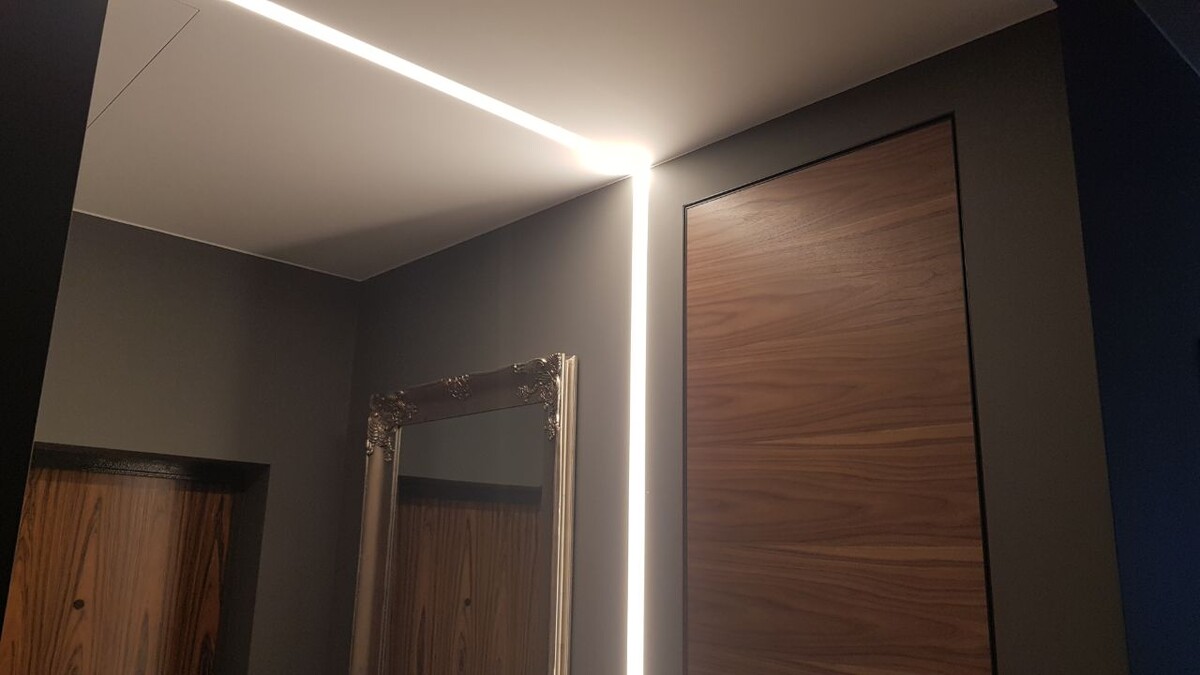 В нашей недавней публикации мы рассказывали о создании гипсокартонной конструкции на потолке, чтобы спрятать коммуникации. Вот что у нас получилось. Плюс добавили профиль для световой линии на потолке и стене. Световая линия – это технология использования LED-подсветки, для оформления дополнительного освещения. Это отличная альтернатива бра и другим светильникам. Для световых линий используется светодиодная лента с липким слоем, которая укладывается в специальный алюминиевый профиль и укрывается рассеивателем (полупрозрачным пластиковым полотном), в один уровень с поверхностью потолка. С помощью световых линий можно создать дополнительный источник света, сделать атмосферу помещения более уютной, а также визуально увеличить пространство. С помощью световых линий можно сделать акцент на различных деталях, арках, нишах, балках или ступенях, это придаст им особый вид. Как пример, прикрепим фото на одном из наших объектов, световая линия в прихожей. Это простой способ сделать интерьер еще и