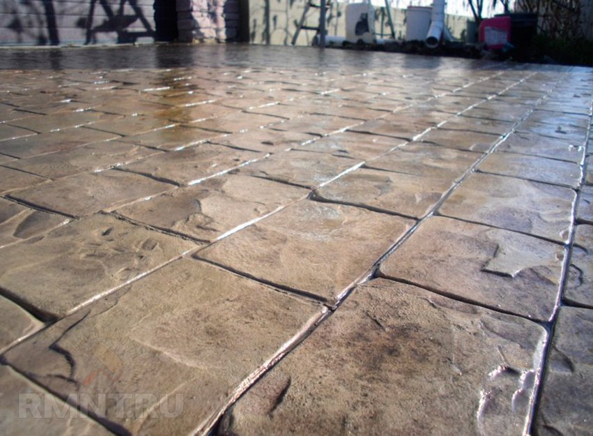 На завершающей стадии верхний слой бетона штампуют специальными полиуретановыми формами. Причём их не обязательно покупать, можно взять в аренду. Вариантов форм существуют десятки, выбор зависит от задач ландшафтного дизайна.