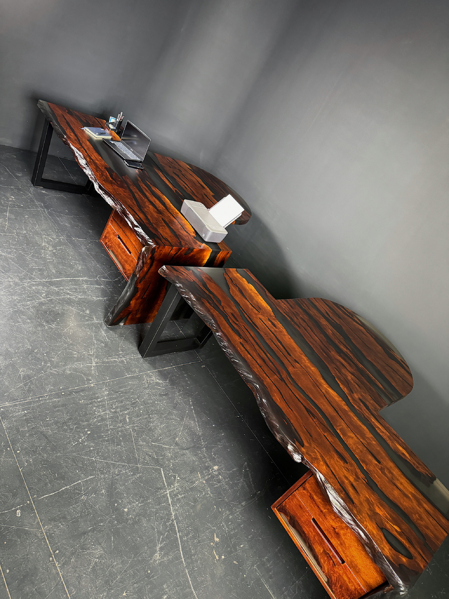 К нам пришёл запрос от клиента на 2 рабочих стола для руководителя. Фишек много, но обо всём по порядку. Это практически идентичные столы по всем техническим характеристикам кроме природной составляющей. Как ни крути, но двух одинаковых слэбов не бывает. Поэтому стиль столов и их исполнение одинаково, а рисунок дерева различается. Мы использовали граб и графитовый цвет заливки-это уже классическое сочетание в нашей мастерской. Вообще фишка этих столов в том, что они одновременно и г-образные и т-образные. И фасады ящиков тоже из дерева и смолы. Единый стиль в каждой детали! А на счёт т-обоазности есть еще один нюанс. Эта полукруглая часть - приставная, для переговоров. Можно убрать её вовсе или совместить с другой такой же частью второго стола и…барабанная дробь..получится третий стол! Представляете, насколько это универсально. Размер: 2000*820*55 Дерево: слэбы граба Край: природно заживленный, брашированный Финишное покрытие: матовый лак Об эстетике с душой. Wood For You🤍