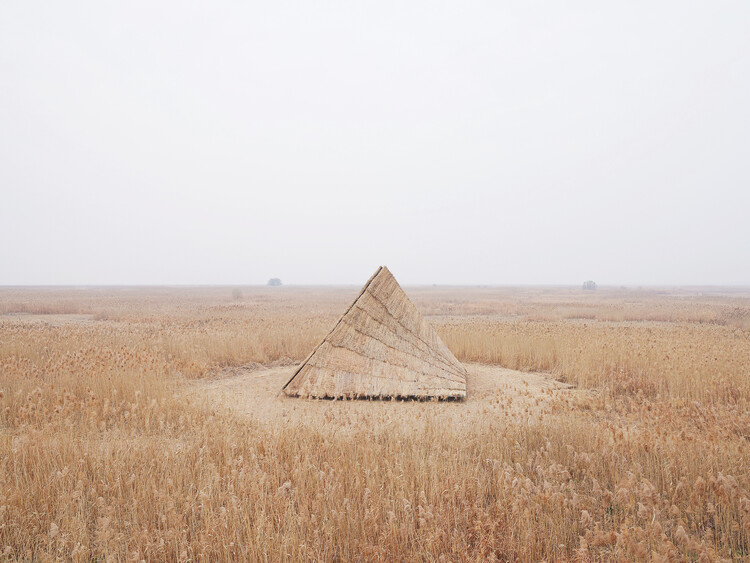 Ведущие архитекторы: Du Yang Место действия: Остров Цзюньшань, расположенный в озере Дунтин, Китай. Каждый год в засушливый сезон северная часть острова превращается в обширную тростниковую равнину, тянущуюся на тысячи метров до самого берега озера и образующую огромное тростниковое болото. Местный организатор пригласил художников для создания произведений искусства прямо на этой природной площадке. Концепция. Прогулка среди тростника напоминала плавание под волнистой поверхностью моря. Высокие камыши, достигающие двух человеческих ростов, закрывали обзор, а солнечный свет проникал со всех сторон. Когда температура поднялась и такие прогулки стали почти невозможными, я осознал свои желания и физические потребности. Что я ищу? Возможно, точку опоры или убежище, где можно остановиться. Тогда в моем сознании возник образ «горы». Я хочу построить здес