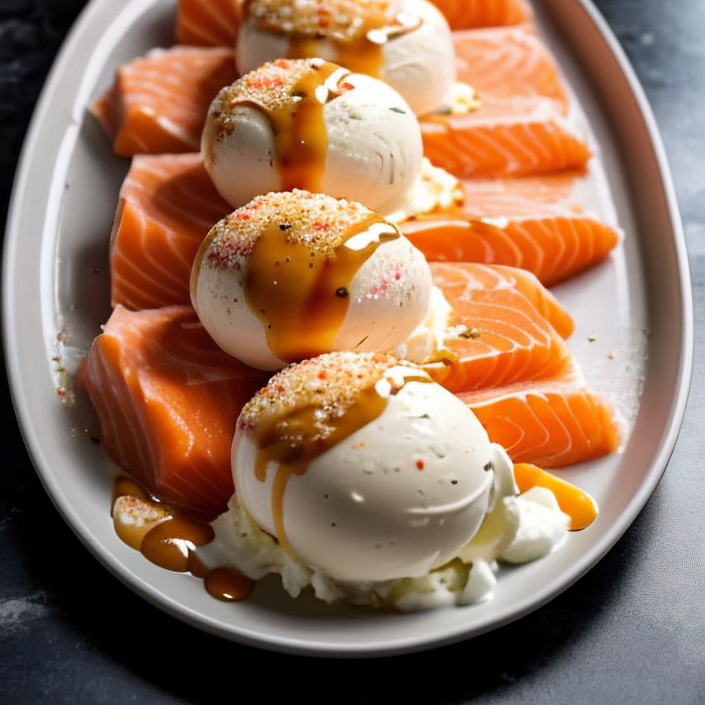 Лосось слабосолёный нарезать, выложить на блюдо. Добавить шарики сырного мороженого. Украсить каплями соленой карамели и семенами кунжута. Это блюдо станет восхищением для романтической встречи или девичника c бокалом Prosecco и просто для хорошего настроения. Дополнением могут быть фрукты, легкий салат. Этот рецепт класса Lux, но все ингредиенты можно купить в магазине. Для тех, кто любит повозиться на кухне, далее подробный рецепт: Лосось слабосолёный: На 1 кг филе лосося 20 гр. соли (Всё! ни сахара ни других ингредиентов не нужно) Филе посыпать солью уложить в контейнер, в холодильник на 24 ч. Сырное мороженое сливки жирностью не менее 30% – 500 мл творожный сыр – 200 г сахарная пудра – 50 г лимонный сок – 1-2 ст. л. молотая смесь 5 перцев - 1 ч.