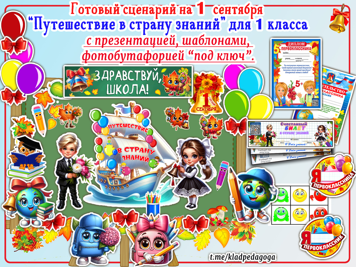 Готовый сценарий "Путешествие в страну Знаний", презентация и оформление на 1 сентября в 1 классе "под ключ!" По сценарию учитель с детьми отправляются на корабле на поиски "Страны Знаний", по ходу мероприятия учитель знакомится с детьми, ребята проходят не сложные испытания, знакомятся с правилами поведения в "Стране Знаний", произносят "Клятву Первоклассников" и торжественно учитель проводит посвящение детей в первоклассники! Презентация помогает погрузиться в атмосферу путешествия с наглядными картинками и звуковыми эффектами в течении всего мероприятия! В наборе: сценарий праздника формата Microsoft Word с возможностью подкорректировать сценарий под себя, презентация с музыкой и звук. эффектами в формате PowerPoint, большой набор фотобутафории для украшения класса и доски: листья, шарики, колокольчики, растяжки, плакат "Корабля", плакаты детей-учеников, плакаты глобусов и рюкзачков и много чего ещё. Шаблоны для сценария: солнце с лучиками, именные медальки "Я первоклассник(ца)" (по