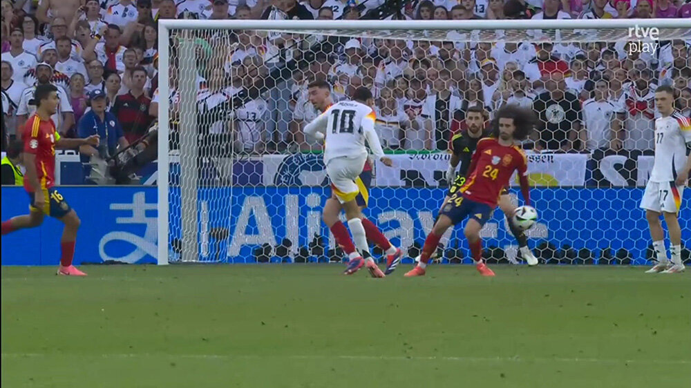 Крайне спорный момент в овертайме 1/4 финала. Испанец Марк Кукурелья вот так остановил мяч в штрафной после удара. Судья Энтони Тейлор ничего не зафиксировал. Увидел момент, сразу показал игрокам, что можно продолжать игру. Все немцы были в шоке. Самый яркий – Джамал Мусиала. Мы смотрели повторы с такими же лицами. Но ВАР подтвердил: явной ошибки судьи нет, надо играть дальше. Команды продолжили – и Испания забила в конце второго экстратайма. Анатолий Синяев, экс-судья и автор телеграм-канала «Але, рэф» объясняет: это не пенальти, потому что рука естественно увеличивает площадь тела. Вероятно, речь о том, что рука естественно расположена вдоль тела. Не поднята, не отставлена. «Попадание в руку Кукурельи очевидно, но он ее опускает, уклоняется... За такое не свистят», – сказал бывший испанский арбитр Эдуардо Итурральде Гонсалес. Сергей Лапочкин в эфире «Матч ТВ» тоже поддержал решение арбитра: «Мы видим, что рука чуть отставлена, но она в естественном положении. Причем расслаблена – пос