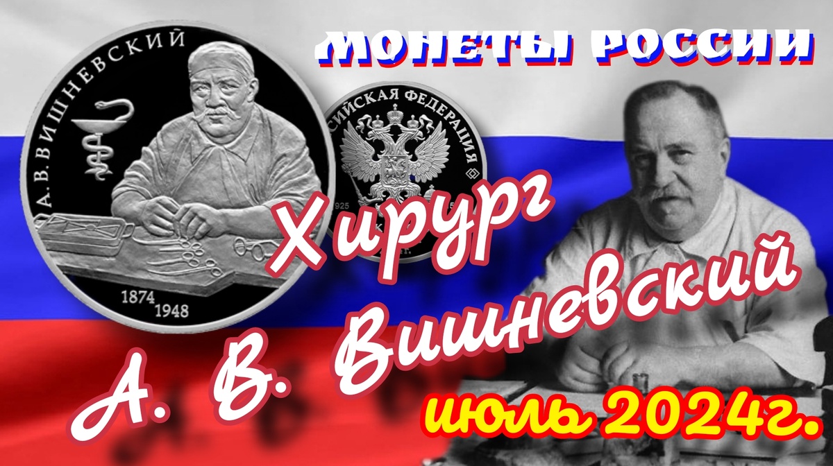 Третья монета выпущенная в обращение Банком России 5 июля 2024 года называется «Хирург А.В. Вишневский, к 150-летию со дня рождения». Вышла она в серии «Выдающиеся личности России». Одновременно с этой монетой Банк России выпустил в обращение монеты «Спартак» и «Трудовые резервы» из серии «Российский спорт». Об этих двух монетах вы можете узнать пройдя по этой ссылке. Но, перед этим предлагаю познакомиться с монетой посвящённой А. В. Вишневскому. Номинал: 2 рубля Металл: серебро 925 пробы Качество: пруф Масса драг.металла в чистоте: 15,55 гр. Диаметр: 33,0 мм Боковая поверхность: рифление Тираж: 3.000 шт. Аверс монеты стандартный. Всё как обычно: Герб России; надписи: «РОССИЙСКАЯ ФЕДЕРАЦИЯ», «БАНК РОССИИ», «2 РУБЛЯ», «2024г.», «Ag925», «15,55», знак монетного двора «СПМД». На реверсе портрет А. В. Вишневского, сидящего за столом. На столе разложены хирургические инструменты. Слева от Вишневского изображена чаша Гигиеи (рюмка обвитая змеёй). Слева вдоль канта идет надпись «А.В. ВИШНЕВ