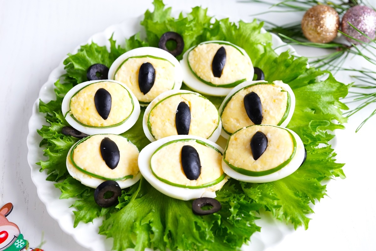 Автор: Лялич, 31.10.23 Простая, но эффектная закуска из яиц для новогоднего стола 2024. Изюминкой блюда является его внешний вид, напоминающий глаза дракона. Закуска готовится из яичных белков с начинкой из желтков, сыра и майонеза, а для декора используются маслины и кожица огурца. Блюдо получается нежным, с приятной чесночной остринкой. Ингредиенты (на 3 порции): Пошаговый фото рецепт "Фаршированные яйца 'Глаз дракона'" Шаг 1: Подготовьте все необходимые ингредиенты. Шаг 2: Отварите яйца вкрутую (10 минут после закипания), остудите их в холодной воде. Очистите яйца и разрежьте вдоль на две части. Аккуратно извлеките желтки, не повреждая белки. Шаг 3: Переложите желтки в миску и разомните их вилкой до мелкой крошки. Шаг 4: Натрите сыр на мелкой тёрке и добавьте к желткам. Шаг 5: Пропустите чеснок через пресс и добавьте к желткам и сыру. Добавьте майонез и хорошо перемешайте. Посолите