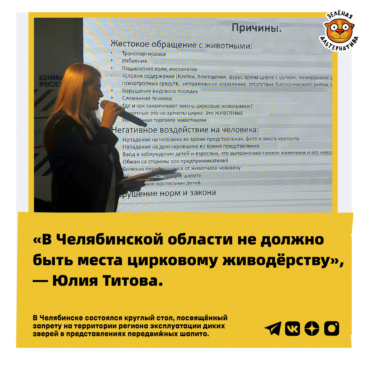 В Челябинске состоялся круглый стол, посвящённый запрету на территории региона эксплуатации диких зверей в представлениях передвижных шапито. В мероприятии приняли участие представители местных органов исполнительной власти, контрольно-надзорных органов, а также активисты общественных организаций. Встреча проходила в Штабе общественной поддержки Челябинской области. Это большое важное событие для зоозащитников всей страны.