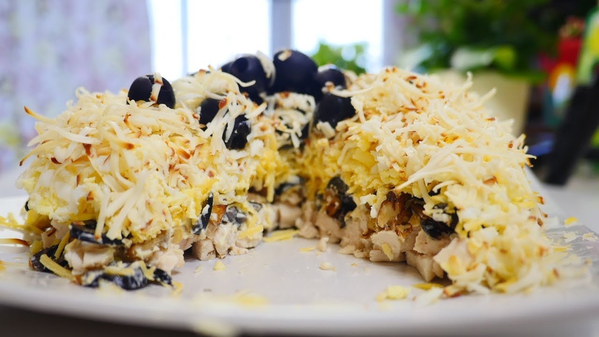 Салат "Черный жемчуг" Идеальный выбор для новогоднего стола 2024! Этот оригинальный, но легкий в приготовлении салат "Черный жемчуг" с уникальной добавкой чернослива, фаршированного орехами, порадует всех гостей. Ингредиенты (на 4 порции): Приготовление: Шаг 1: Чернослив вымойте и залейте кипятком для распаривания. Шаг 2: Надрежьте чернослив сбоку и начините кусочками орехов. При желании орехи можно слегка подсушить в духовке при 180 градусах или на разогретой сковороде, помешивая, около 5 минут. Шаг 3: Яйца сварите вкрутую (около 10 минут), охладите под холодной водой, очистите и натрите на крупной терке. Шаг 4: Сыр также натрите на крупной терке. Шаг 5: Крабовые палочки также натрите на крупной терке. Шаг 6: Охлажденное сливочное масло также натрите на средней терке. Шаг 7: Выкладывайте салат "Черный жемчуг" слоями (можно использовать специальную форму-кольцо или срезанную в виде широкого кольца пластиковую бутылку): Шаг 8: Украсьте салат "Черный жемчуг" по желанию: орехами, черносли