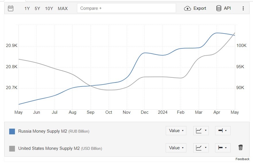 На американском графике мы видим сильный разгон денежной массы в 2020-2021 годах - это поддержка населения и бизнеса в пандемию. На российском она начала сильнее разгоняться в 2022-2024 - это сами знаете, что.
