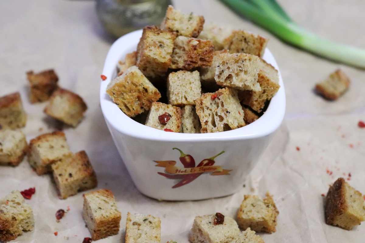 Такие сухарики моя семья часто просит приготовить. Есть любители просто похрустеть, а кто-то любит горсточку в суп положить, например в гороховый, да и салаты с ними получаются вкусными! Сухарики получаются острые, ароматные, с натуральными специями. Они, несомненно, полезнее и вкуснее магазинных, которые я никогда не покупаю. Время приготовления — примерно 30-40 минут Приготовить сухарики просто, нужен только черствый вчерашний хлеб и специи. Хлеб можно взять любой — хоть черный, хоть белый, да и специи по вкусу. Мы любим сухарики из черного или серого хлеба, а из специй я обычно беру соль и острый перец.