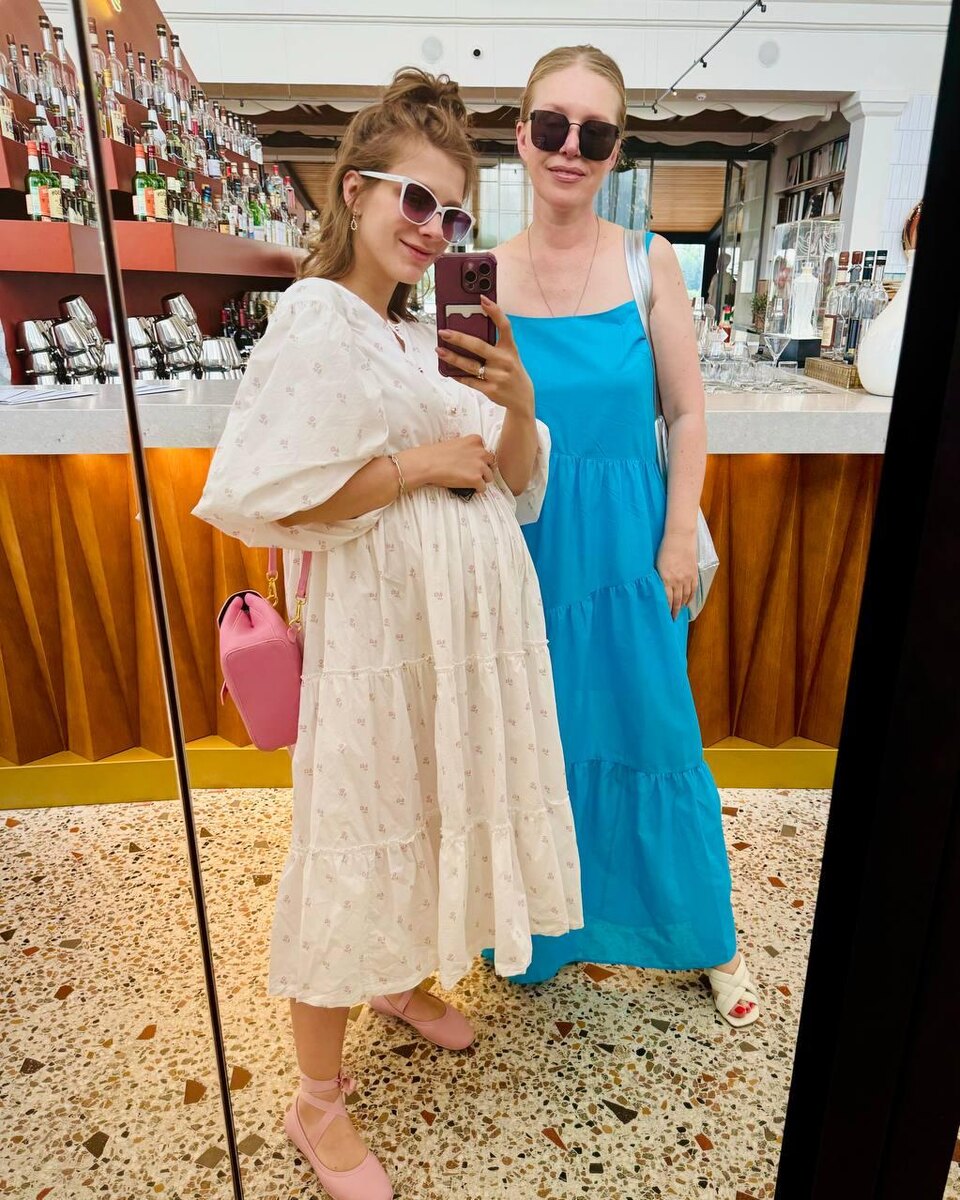 Трогательным снимком в компании мамы похвасталась в социальных сетях популярная актриса Елизавета Арзамасова. Московская жара многих выбивает из колеи. Непросто сейчас и беременной Елизавете Арзамасовой. Актриса мечтает о коротком топе и мини-юбке, но из-за увеличившихся размеров может позволить себе разве что свободного кроя платья. Впрочем, в таких женственных нарядах, словно из иной эпохи, Елизавета нравится своим поклонникам даже больше. Накануне Арзамасова прогулялась по городу в компании мамы и сделала селфи у зеркала в одном из ресторанов столицы. «Выход в свет» с мамулей. Я смешнючая 🤣 Всё ещё ножку пытаюсь ставить модельно, а про резинку на голове забыла! Чуууууудесное состояние! 🤣❤️👍», — подписала кадр артистка. А ее поклонники тем временем с восторгом рассматривали небрежный пучок на голове актрисы, ее изящные розовые туфельки и, разумеется, сильно подросший живот. Многие также отметили, что Арзамасова все еще кажется им милым подростком, а не взрослой женщиной, у которой