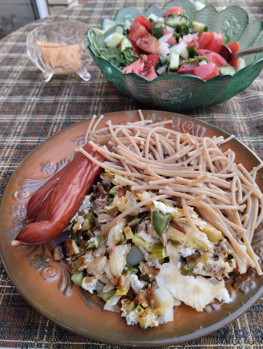 Привет, друзья! Сегодня пятница, у меня много фото скопилось того, что я готовлю в последнее время. Покажу лишь пару наших ужинов -в четверг и сегодня, в пятницу. Вчера (в четверг) я готовила спагетти из гречки (цельнозерновые), пожарила колбаски с грибами и зеленью редиски с яйцом. Нашла в морозилке колбаски с сыром как раз к ужину приходились , ну и салат😁 Сегодня (в пятницу) ужин был другой, но не скажу, что более шикарный. Только салат и айва, ещё курили арбуз, завтра будем пробовать. Вот такие у нас ужины. Ваша 😊 @leila