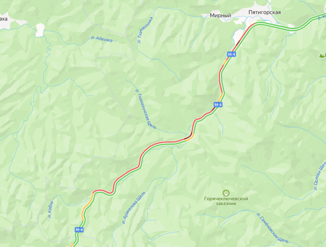 «В районе 4:30 уже наблюдались пробки на М-4 «Дон» (Восточный обход Краснодара) в сторону Горячего Ключа. Огромная вереница машин стояла у ТЦ «Oz Молл», когда въезжаешь на трассу с развязки, там еще справа находится пост, а слева начинается водохранилище», - написала читательница «Блокнот Краснодара» Ангелина. На момент выхода публикации сервис «Яндекс Карты» показывал гигантскую пробку в районе села Хребтового – с 1398-го по 1413-й км федеральной трассы. Машины едут медленно, на преодоление бордового и оранжевого участка пути у водителей уйдет около 1 часа 15 минут. Пробка перед Молдавановкой Пробка протяженностью 7 километров собралась у Горячего Ключа. Автомобилисты стоят от гостиницы «Харчевня» до станции скоростного городского транспорта (канатка). По оптимистичным прогнозам, путники потратят здесь около часа. Пробка в районе Горячего Ключа Относительно небольшие заторы наблюдаются в Джубге и Архипо-Осиповке. Подписывайтесь на нас в Telegram Скриншот: "Яндекс Карты"