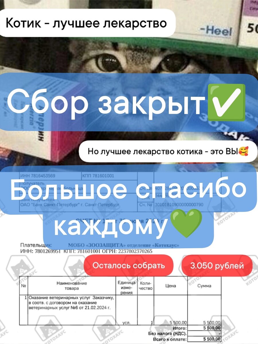 ❗Сбор на поощрение помощников за чистоту в КотоХаусе и на оплату ЛЕЧЕНИЯ кошек❗ Друзья, с вашей помощью мы закрыли счёт за ветеринарные услуги! Спасибо вам большое🙏💖 У нас с вами есть 3 дня, за которые мы должны собрать сумму, которая необходима для поощрения за труд, чистоту и любовь: 2⃣1⃣.8⃣7⃣0⃣ рублей ❗ Это большая сумма для одного, двух и даже трёх человек... Но нас с вами МНОГО❣️ Все видят какая в приюте красота и порядок💫 Давайте же поддержим этот нелёгкий труд пожертвованием! Ведь помощники много времени проводят в приюте, отдают свои силы и любовь ради комфортной жизни котов и кошек. Их старания не должны оставаться не замеченными🥲🙏 Вместе с вами мы справимся❤🔥 Просим вас о любой помощи: 🔸пожертвования 🔸 репосты 🔸 участие в опекунском и попечительском совете на постоянной основе Актуальна любая помощь по вашим силам❗ Каждое пожертвование важно, будь это 10, 50, 100 рублей! Совместными усилиями мы сможем справиться, ведь нас в группе 4.000+ Человек❣ Пожалуйс