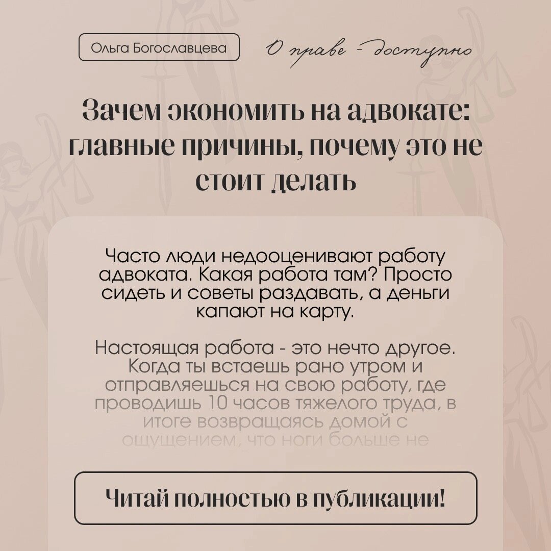 Думаете о том, как сэкономить на адвокате? А что, если я скажу вам, что это далеко не самая лучшая идея. Часто люди недооценивают работу адвоката, полагая, что их труд не требует больших усилий: просто сидеть и раздавать советы, а деньги сами капают на карту. Но реальность такова, что работа адвоката — это сложный и ответственный труд, требующий глубоких знаний и умения применять их в конкретных ситуациях. Настоящая работа адвоката не всегда видна с первого взгляда. Она включает в себя множество этапов и требует постоянного внимания к деталям. Мой день начинается в 06:30 с холодного душа, зарядки и доставки сына к метро. Затем — кофе, завтрак, и начинается основной рабочий процесс: консультации, следственные действия и судебные процессы. Часто я провожу бесплатные онлайн-консультации, где в течение часа изучаю проблемы клиента, анализирую нюансы, указываю на слабые места и предлагаю помощь. К сожалению, бывает так, что люди возвращаются к адвокату после неудачного самостоятельного веде