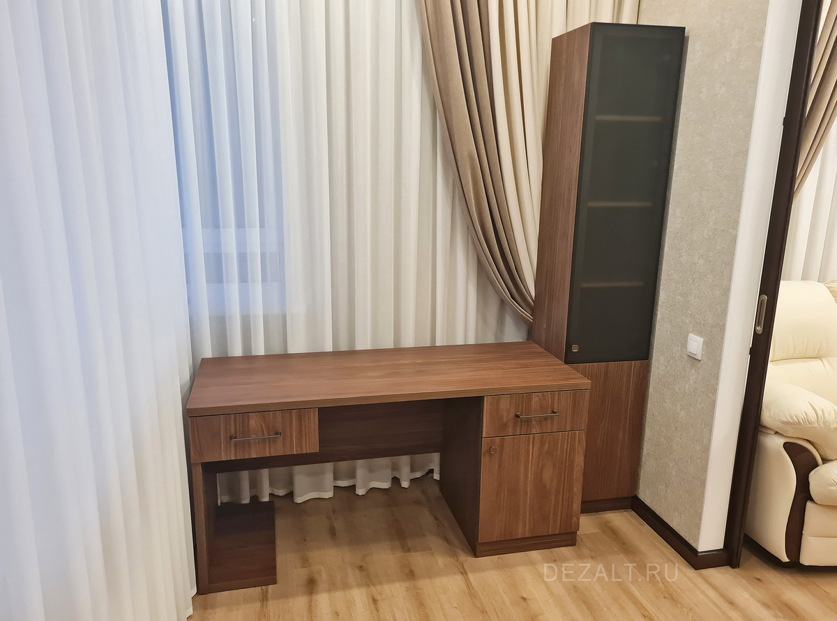 Сделали шкаф письменный и закрытый узкий шкафчик для бумаг. На столе будет стоять монитор, а снизу мы предусмотрели место для системника. В узком шкафу будут стоять кое-какие папки с документами. Из небольших особенностей, тут толстая столешница 32мм, сделана вручную путем склеивания двух панелей по 16мм. Кромка наклеивается широкая, толщиной 2мм. Такая столешница полнотелая, она получается тяжелая, массивная. Левая ножка тоже склеенная, толстая. Изначально, я планировал использовать плиту толщиной 25мм, хотел сделать не только столешницу из нее, но и все ножки стола, боковины шкафа. Но когда клиент понял, что внутри тумбы станет меньше места, что шкаф так же заузится внутри из-за толстых панелей, попросил убрать толстую плиту. Поэтому мы решили сделать только толстую столешницу, так и дешевле выходило и больше места оставалось в тумбе и в шкафу. Но вдруг клиент попросил сделать левую ногу тоже толстой, чтобы стол выглядел более массивным и устойчивым. Я сделал. А потом подумал и с