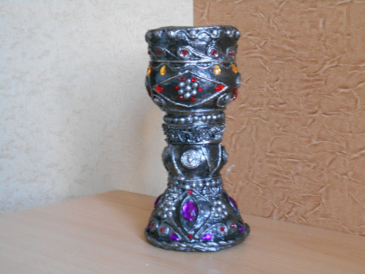 Про Грааль ничего неизвестно, кроме того, что он всё же когда-то был. А какой он... Ну, думаю, каждый вполне может представить и сделать его по-своему. Прзнаюсь, это самая первая моя работа с преображением пластиковых бутылок. Опыта - ноль, всё на интуиции. Может, она и далека от совершенства, но мне эта чаша особенно дорога. Материалы: пластиковая бутылка, джутовый шнур, шнур из скрученной салфетки, сухой горох, пшеничная крупа, стразы, металлическая крышка от стеклянной банки, картонная втулка, акриловые краски, акриловый лак, клей ПВА, полимерный клей.