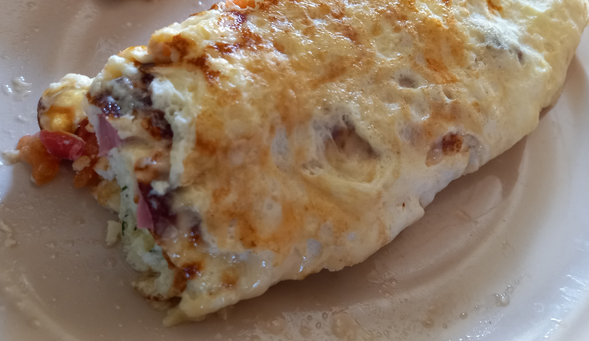 Измельчаем укроп, режем кубиками любую колбасу или ветчину, сыр трем на терке, помидор режем кубиками. В миску разбиваем четыре яйца, солим, наливаем 100 мл молока. Взбиваем венчиком до однородности. Жарим блинчик. На посыпаем укропом. Когда омлет приготовился, сворачиваем его в трубочку на сковороде и отодвигаем его в сторону. Делаем второй блинчик - на него выкладываем колбасу, также сворачиваем дальше в трубочку. Затем третий блинчик - с помидорами, и продолжаем трубочку, и последний блинчик с сыром. Сворачиваем трубочку. Выкладываем на тарелку.