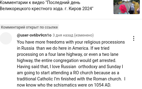 Примерный перевод: У вас больше сводобы ходить крестными ходами чем у нас в Америке. Если бы мы попытались пройти крестным ходом по 4-х полосной дороге, или даже по 2-х полосной, весь приход церкви был бы арестован. Говоря это, я люблю Русское Православие и в воскресенье я пойду в первый раз и начну посещать богослужения в русской православной церкви потому что как традиционный католик, я перестаю быть им в Римской католической церкви. Я теперь знаю кто есть действительный раскольник в 1054 году