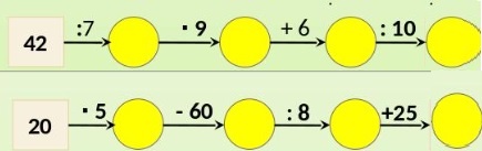 Начнём с натуральных чисел Считаем устно: Проверяем: 1)42:7=6, 6*9=54, 54+6=60, 60:10=6 2) 20*5=100, 100-60=40, 40:8=5, 5+25=30 Обращаем внимание на выражение: 60:10 Как найти значение последнего выражения? Можно так: вспомним, что знак ":" можно заменить дробной чертой, тогда результат будет записан в виде обыкновенной дроби, а ещё её можно перевести в десятичную дробь Потренируемся? Ответы для самопроверки: 1 столбик: 0,4; 7,5; 18,6; 2) 0, 04; 0,75; 1,86; 3) 0,004; 0,075; 0,186 Обращаем внимание на то, что при делении на целое число исходное число уменьшается! Заметили, что мы перешли к обыкновенным и десятичным дробям? Вспомним, как разделить десятичную дробь на 10,100 и тд Считаем устно: Ответы: 1) 0,75; 0,086; 1,457; 2) 0,0456; 0,182; 0,009; 3) 0,0123; 0,00572; 0,4561 И вновь математическая цепочка Ответ пишите в комментарии До встречи!