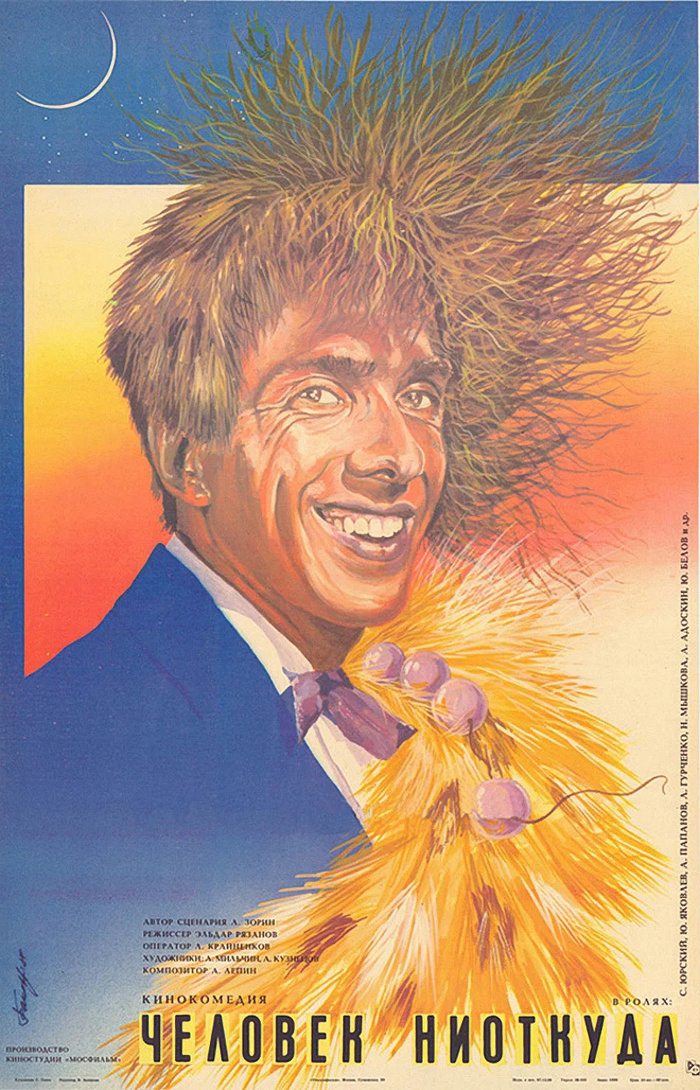 Пересмотрел давеча "Человек ниоткуда" (1961, режиссёр Э. Рязанов). Поразился, насколько эта самобытная комедия выбивается из стандартов представления среднестатистичного зрителя о советских фильмах. Во-первых, завораживающая гиперболизированная пластика лица и тела главного героя - Чудака - молодого С.Юрского, творящего в кадре буффонаду, затмевающую ужимки мистера Бина (Р.Аткинсон) и Бенни Хилла (А.Х.Хилл) с Джиммом Керри вместе взятых. Во-вторых, многоликий А.Папанов (играет здесь четыре роли), ломающий четвертую стену и жалующийся, что ему ограничивают реализацию творческого потенциала, предлагая роли злодеев. В-третьих, легкая сатира на некоторые аспекты советской действительности (чинопочитание и чрезмерное опекание лоботрясов) и одновременно уколы в сторону капиталистического строя (поведение дикарей племени тапи сравнивается с нравами буржуазного Запада). В-четвертых, не заявленные в титрах Ю.Никулин (милиционер, снимающий Чудака со столба) и Е.Моргунов (повар в племени). И само