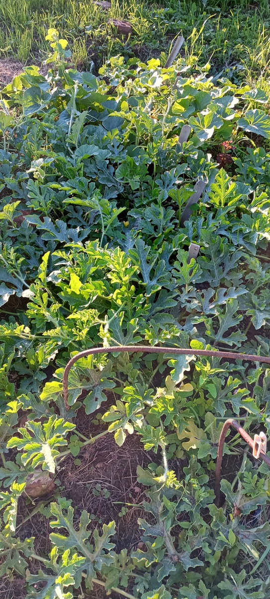 2024 год третий год как я сажаю дыни и арбузы, в первый не выросло ничего, во второй несколько дынь и малюсенький арбуз. И вот сегодня приехала на дачу, а там, первый арбузик. В этом году арбузы у меня растут в открытом грунте, Хотела выращивать их под пленкой, но погода пока хорошая, растут так, сами, как хотят. Проблема у меня была с рассадой. Из моей выжили только один "Бедуин" и два "Подмосковный Чарльстон". И ещё пока не пойму для себя в какие сроки лучше сажать на рассаду. На майские праздники привезла рассаду на дачу и оставила в доме, конечно ей было холодно, большинство погибло. Еще два арбуза купила на рынке, сорт "Пекинская радость" как сказал продавец. В прошлом году такого размера арбузик у меня был только в начале августа. Сейчас ещё много маленьких завязей, буду ждать, какие опылились. Арбузы только поливаю, ни чем не подкармливаю. Тут же с арбузами посадила дыню "Злато Скифов". С рассадой дынь получилось получше, хотя , так же как и арбузы, она у меня остава