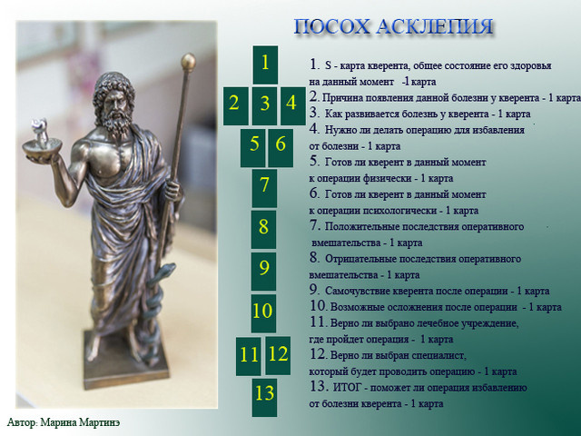 "ПОСОХ АСКЛЕПИЯ" Иногда в нашей жизни и жизни наших близких возникают проблемы со здоровьем.Если вам известно о конкретной болезни человека, то можно проанализировать ситуацию. А порой единственное решение - это оперативное вмешательство.Это всегда вызывает некую обеспокоенность: какие будут результаты,того ли специалиста мы выбрали и как все пройдет...Для ответа на подобные вопросы небольшой расклад "Посох Асклепия". 1. S - карта кверента,общее состояние его здоровья на данный момент -1 карта